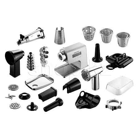 - Насадка-шинковка и две насадки-терки с крупными и мелкими отверстиями помогут быстро и удобно нарезать овощи для салатов, горячих блюд, консервированных заготовок.