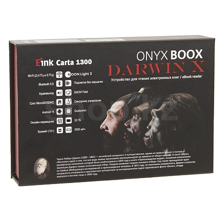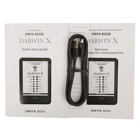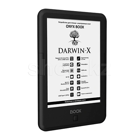 ONYX BOOX Darwin X — компактный ридер с 6-дюймовым экраном E Ink Carta Plus (Carta 1300) с подсветкой и сенсорным управлением. Модель продолжает самую популярную серию производителя и выполнена в классическом корпусе с кнопками управления. Darwin X базируется на современном высокопроизводительном процессоре и имеет 2 ГБ оперативной и 32 ГБ встроенной памяти. Ридер оборудован двухдиапазонным модулем Wi-Fi, позволяющим выходить в сеть интернет и использовать различные сетевые сервисы. Поддержка Bluetooth дает возможность подключать беспроводные устройства, включая наушники и колонки. Благодаря использованию операционной системы Android 11 на ридер можно устанавливать различные сторонние приложения. Входящий в состав ПО ридера аудиоплеер дает возможность прослушивать музыку и аудиокниги, а поддержка функции TTS - озвучивать текстовые файлы.