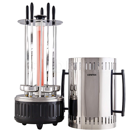 Шашлычница Centek CT-1460 практична и удобна в использовании, снабжена защитным кожухом и чашками для стекания жира и сока. Шампуры выполнены из высококачественного металла и снабжены ненагревающимися ручками. Частота вращения шампуров составляет 12 оборотов в минуту. В комплекте пять шампуров. Мощность 1200 Вт.