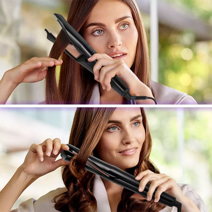 Керамическое покрытие рабочей поверхности бережно выравнивает структуру волос, делая их гладкими и блестящими, а также снимает статическое электричество. Зубцы по краям пластин дополнительно расчесывают волосы во время укладки.