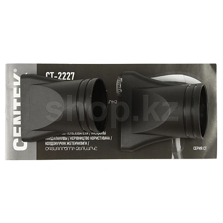 Фен работает в двух режимах интенсивности подачи воздуха и в трех режимах нагрева. Для получения оптимального результата данные режимы можно комбинировать, так как они включаются независимо друг от друга. Безопасность использования фена Centek CT-2227 обеспечивается благодаря наличию защиты от перегрева. Съемная крышка фильтра. Для питания фена используется бытовая электрическая сеть.