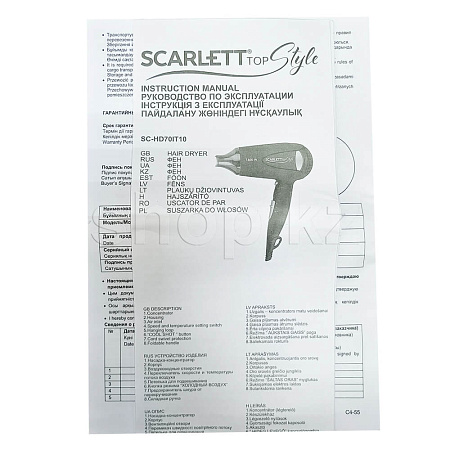 Корпус SC-HD70IT10 выполнен из термостойкого пластика, покрытие «Soft Touch», автоматическое отключение при перегреве, удобная петелька для подвешивания, насадка - сопло. Особая компактная и эргономичная форма, а также высокая мощность этого фена позволяют использовать его как дорожный вариант для сушки и укладки волос в любое время, в любом месте.