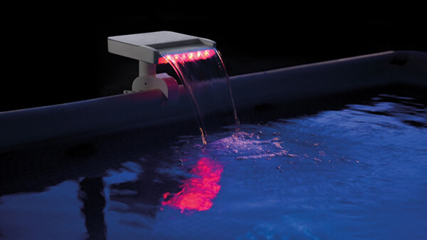 Фонтан 28090 INTEX имеет три режима подсветки: красный, синий и зеленый. Не требует батареек, так как внутри встроенный генератор, который подсвечивает воду.
