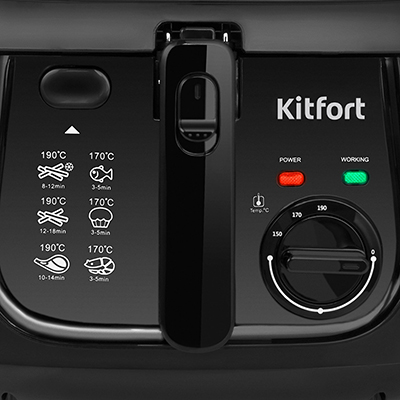 Фритюрница оснащена поворотным регулятором трёх режимов нагрева, необходимых для разных блюд и разного объёма продуктов. Панель подсказок, где можно увидеть, сколько времени потребуется до полной готовности еды, размещена слева от регулятора.