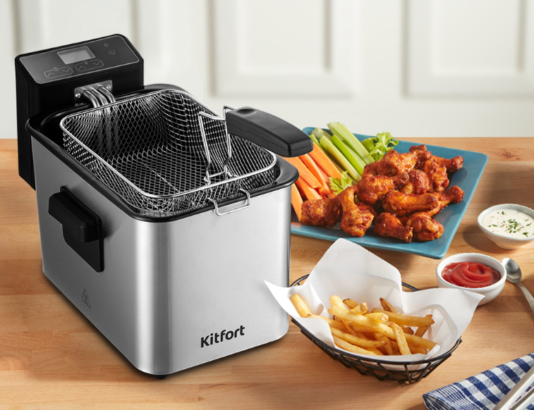 Продукты во фритюрнице Kitfort КТ-4054 готовятся быстрее, чем на сковороде из-за короткого воздействия высокой температуры со всех сторон. Хорошо зажаренные во фритюре продукты покрыты хрустящей корочкой, под которой почти нет масла.