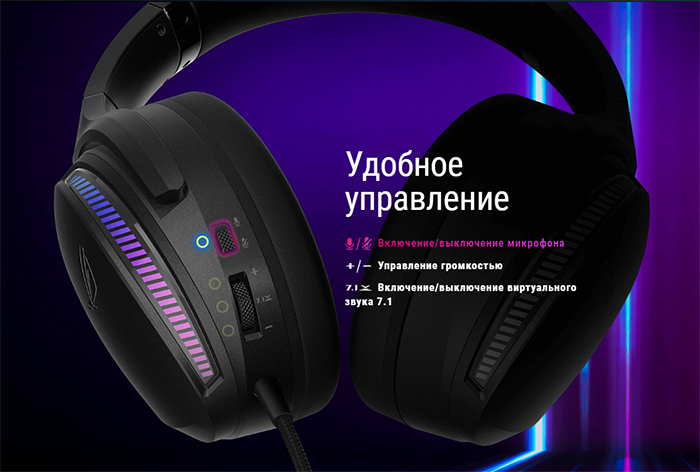 В данной гарнитуре реализована система подсветки, способная отображать миллионы различных цветовых оттенков в виде шести визуальных эффектов. Ее настройка осуществляется в приложении Armoury Crate.