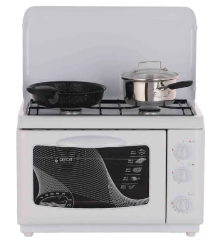 Настольная газовая плита ПГ 100 оснащена варочной поверхностью с 2 конфорками и небольшой духовкой. Корпус имеет эмалированное термостойкое покрытие. Мощность пламени регулируется при помощи поворотных переключателей. Функция газ-контроля духовки отключает подачу газа при потухании огня.
