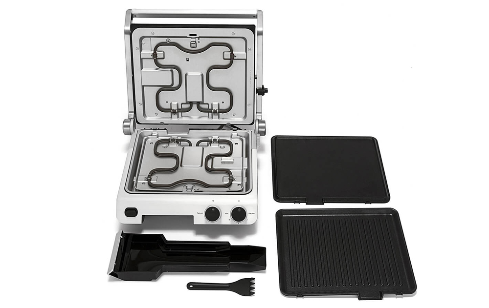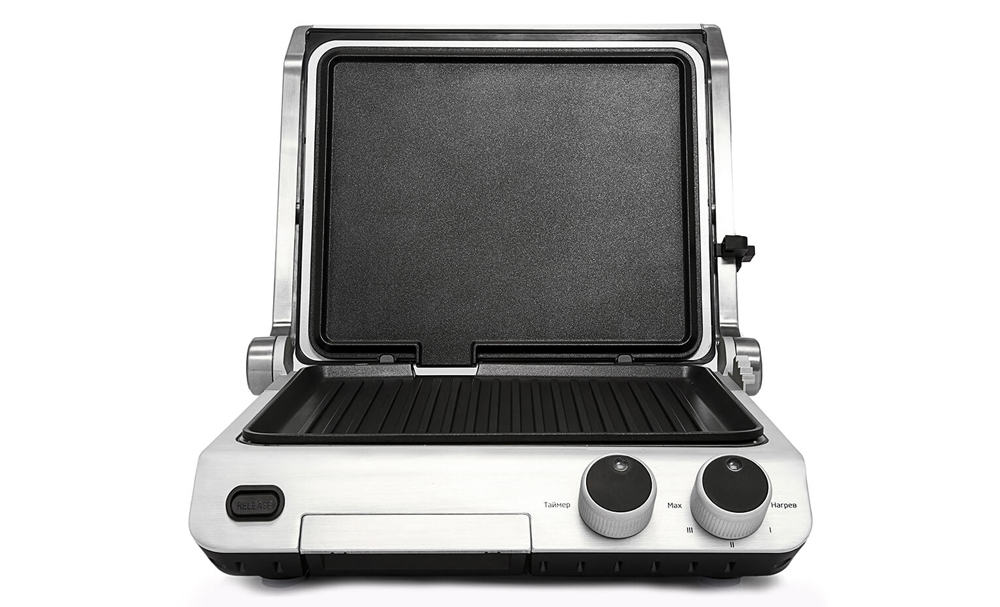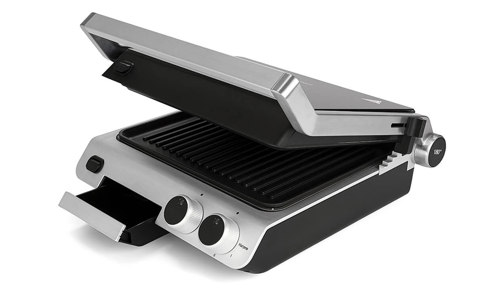 В одностороннем режиме крышка гриля откидывается на 180°, и гриль превращается в большую жаровню. Для приготовления можно использовать обе поверхности. Съёмный поддон для сбора жира