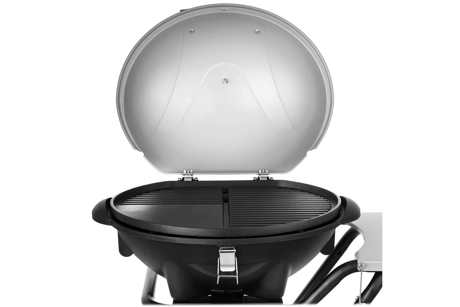 Нагревательная панель изготовлена из алюминия с нанесённым антипригарным покрытием. ¾ панели ребристые, ¼ - гладкая. Крышка легко откидывается, её можно держать открытой либо снять для удобства приготовления барбекю-блюд.