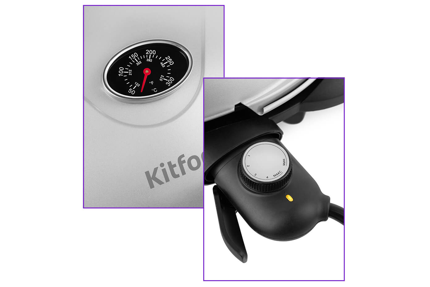 Благодаря регулятору t вы можете быстро приготовить блюдо на высоких t (гриль) и при средних t (барбекю). В электрогриле также можно готовить методом томления, жарки и копчения. Оснащён термостатом для поддержания установленной t и термометром.