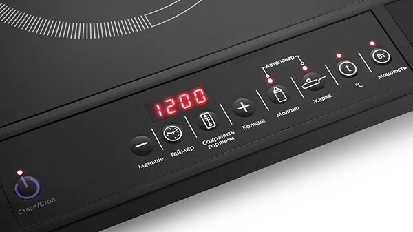 Мощностные режимы регулируются от 120 до 2000 Вт. Плита имеет 7 программ приготовления, таймер времени приготовления и отложенный старт до 24 часов.