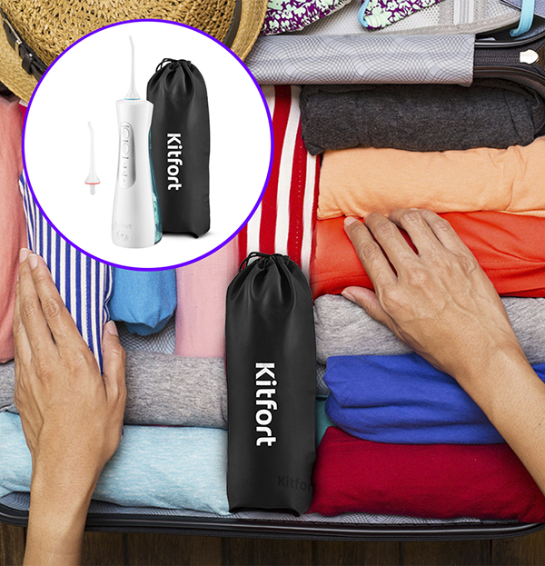 Удобно брать с собой Ирригатор КТ-2901 лёгкий и компактный. Его удобно брать с собой даже в небольшой сумке. Прибор можно хранить и перевозить в специальном чехле из водонепроницаемой ткани, который идёт в комплекте. |