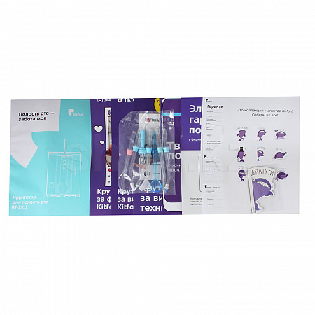 В комплекте идут различные насадки: 3 классические струйные насадки, насадка для удаления зубного камня и налёта из-под линии десны, насадка для ортодонтических конструкций, насадка с щёточкой для удаления налёта, насадка для чистки языка.