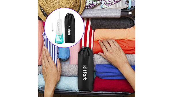 Ирригатор лёгкий и компактный. Его удобно брать с собой даже в небольшой сумке. Прибор можно хранить и перевозить в специальном чехле из водонепроницаемой ткани, который идёт в комплекте.