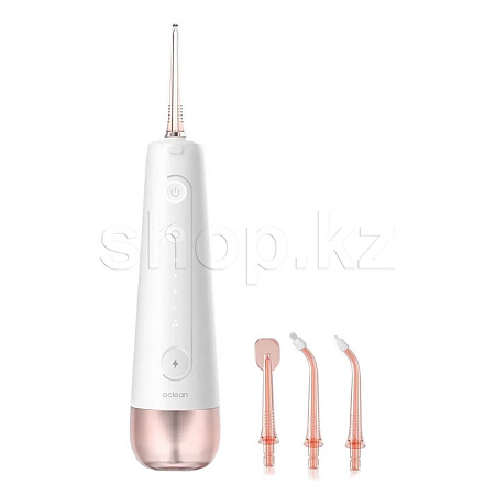 Ирригатор Oclean W10 выполнен в стильном корпусе из крепкого белого матового пластика с полупрозрачной съемной колбой лимонно-зеленого или персиково-розового цвета для отслеживания уровня воды и очистки устройства. Также имеется эластичная ручка в цвет колбы для более удобного использования, над которой расположена крышка для заполнения колбы водой (ее объем 200 мл).