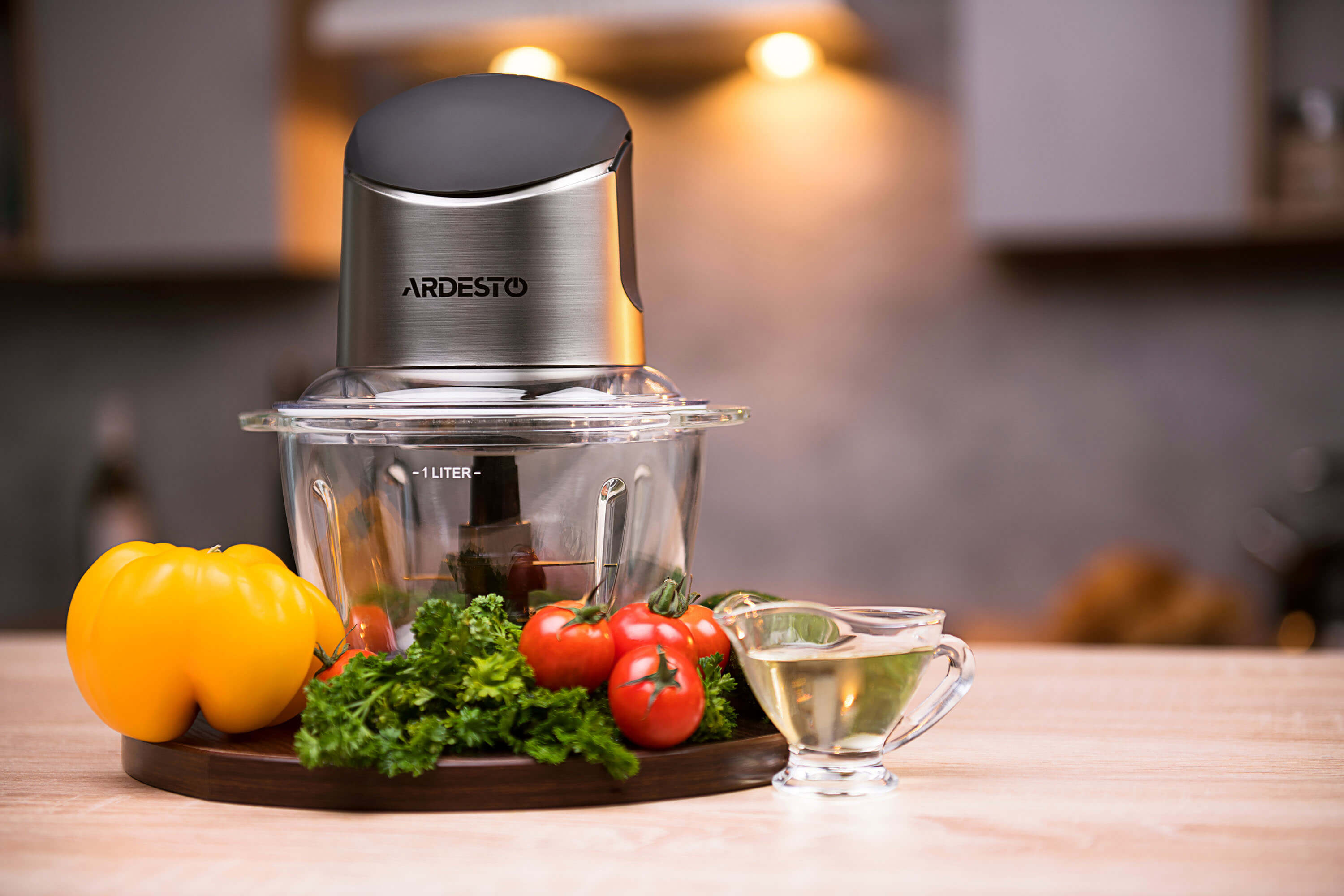 Двойные ножи выполнены из прочной и надежной нержавеющей стали с титановым покрытием, которое обеспечивает идеальную заточку в течение длительного времени использования. Для удобства, стеклянная чаша на 1 л получила ручки и нескользящую прорезиненную подставку. Двигатель мощностью 400 Вт защищен от перегрева.
