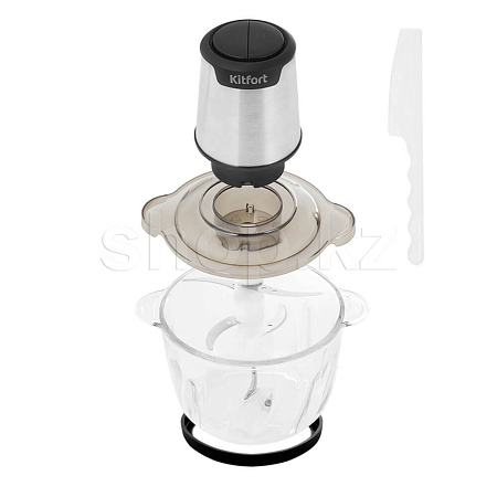 Управление измельчителем осуществляется нажатием на кнопки первой и второй скорости в зависимости от твёрдости продукта. Вместительная чаша ёмкостью 2.5 л выполнена из стекла. Чашу можно закрыть крышкой и использовать для хранения продуктов.