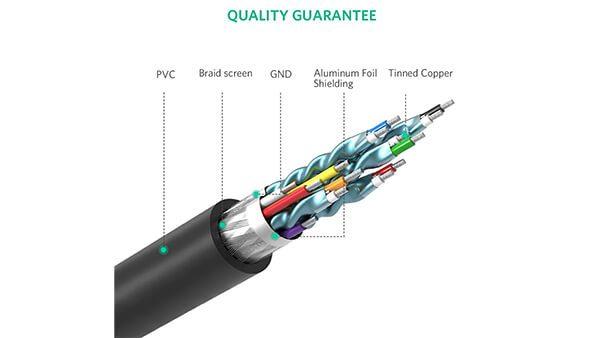 Экранирование из алюминиевой фольги, экранирующая оплетка и линия заземления, защита с тройным экраном, утолщенный луженый медный сердечник обеспечивают более стабильную передачу сигнала. А оболочка из ПВХ делает его более мягким и гибким.
