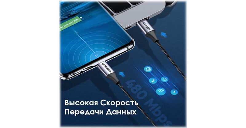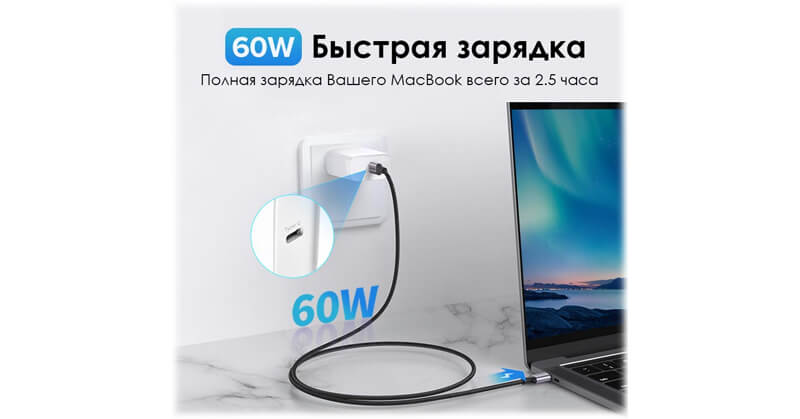 Кабель оснащен алюминиевыми разъемами и контактами из сплава цинка. Он поддерживает режим зарядки мобильных устройств мощностью PD60W/45W/18W, а также стандарт Quick Charge 3.0/FCP с током заряда до 3A и позволяет выполнять синхронизацию данных со скоростью передачи данных до 480 Мб/с.