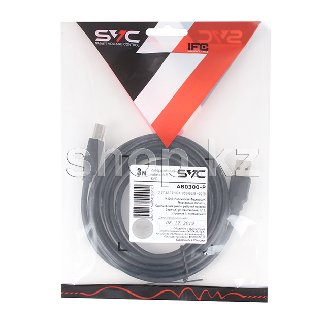 Кабель USB 2.0 Type A-B SVC AB0300-P, 3m, Black, OEM