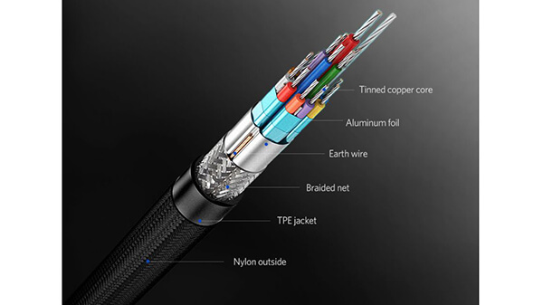 Защита кабеля от помех обеспечивается тремя слоями экрана, сами провода имеют покрытие из TPE-пластика, который дополнительно защищен слоем нейлоновой оплетки.