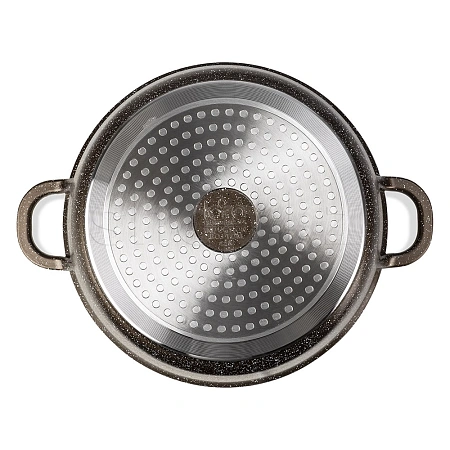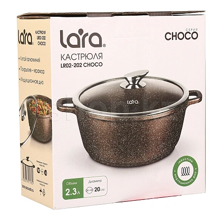Мрамор – это идеальный акцент в дизайне, а кастрюли LARA серии «Choco» – это идеальная посуда высокого качества для ежедневного приготовления блюд. Кастрюли этой серии позволят получить не только новый опыт во взаимодействии с посудой, но и превосходный результат взаимодействия с ней. Серия выполнена из литого алюминия и обладает прекрасными теплопроводными свойствами. Прочное антипригарное покрытие с минеральными частицами надежно защищает дно и стенки от повреждений. Крышка с паровыпуском изготовлена из жаропрочного стекла, имеет стальной обод и удобную ручку G-формы. Индукционное дно подходит для всех типов плит.
