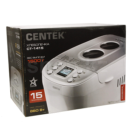 Хлебопечка Centek CT-1415 – это полезный кухонный прибор, который поможет приготовить выпечку, йогурты и джемы. Хлебопечка поддержит температуру готовой выпечки в течение часа, а с помощью программируемого таймера вы сможете отложить старт ее работы до 15 часов. Компактный прибор с теплоизолированным корпусом и смотровым окном на крышке обладает всем необходимым функционалом. Имеет 19 автоматическими программами, включая функции джем, кекс, йогурт.  Масса выпечки: 500, 750 г.