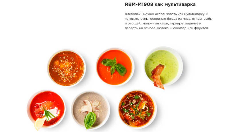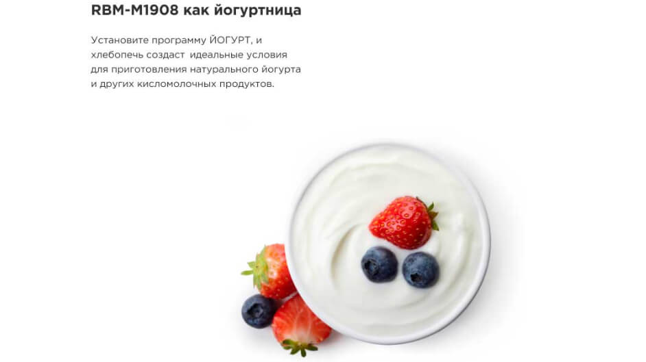 Хлебопечь RBM-1908 является многофункциональной моделью – выпечка, каши, вторые блюда, десерты, джемы, напитки, йогурты – целых 19 автоматических программ приготовления, включая специальные программы для приготовления теста.