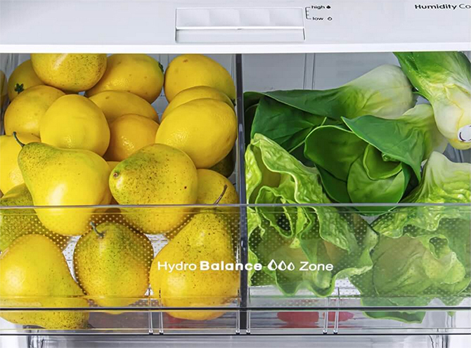 Комплектация холодильника расширена за счет установки функционального сосуда «Hydro Balance Zone» – зоны с настройкой влажности для оптимального хранения фруктов или овощей. В данном сосуде создан особый микроклимат, который предотвращает излишнее испарение, овощи и фрукты не усыхают, не вянут, не плесневеют и хранятся дольше обычного.
