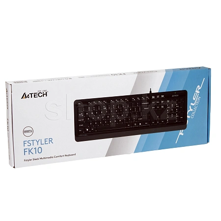 Доступная и функциональная клавиатура A4Tech Fstyler FK10 подключается к компьютеру посредством USB-порта. Длина кабеля составляет 1.5 м. Клавиши обладают квадратной формой, обозначения английских, русских и казахских букв выполнены белым цветом и защищены от истирания. Имеются дополнительные мультимедийные клавиши. Плюсом модели становится то, что производитель оснастил ее надежной влагозащитой.