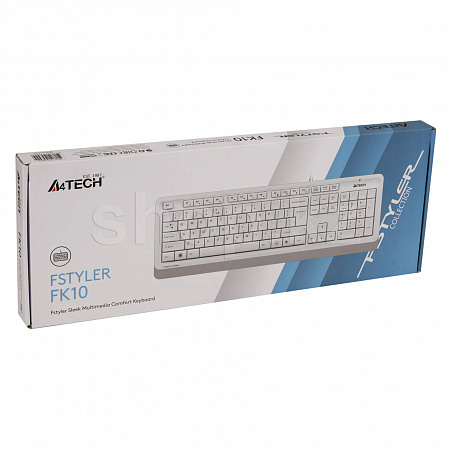 Доступная и функциональная клавиатура A4 Fstyler FK10 подключается к компьютеру посредством USB-порта. Длина кабеля составляет 1.5 м. Клавиши обладают квадратной формой, обозначения английских, русских и казахских букв выполнены белым цветом и защищены от истирания. Имеются дополнительные мультимедийные клавиши. Плюсом модели становится то, что производитель оснастил ее надежной влагозащитой.