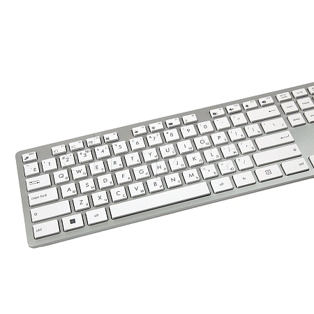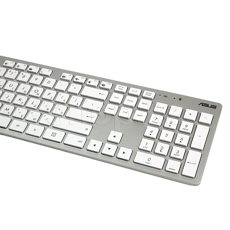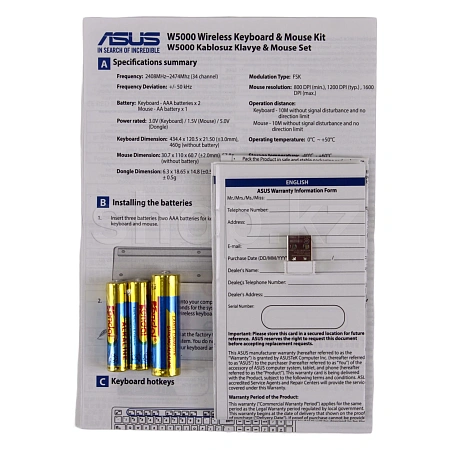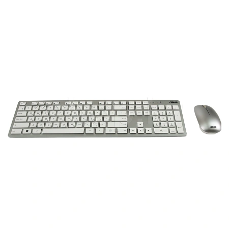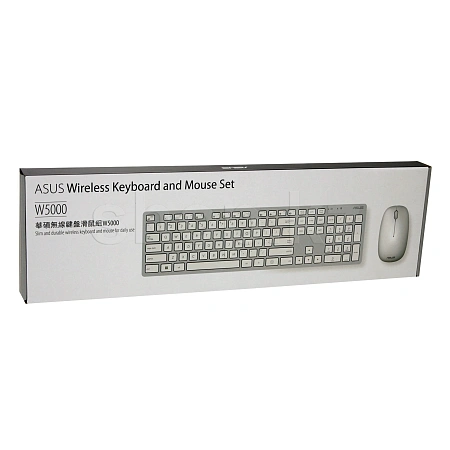 Клавиатура+мышь ASUS W5000 предназначены для компьютерного управления, выполнены в серо- черном цвете, рисунков и подсветки нет. Классическая клавиатура оснащена 104 клавишами с мембранным механизмом, в том числе с функциями мультимедиа, интернет, низкопрофильностью. Раскладка выполнена в белом цвете, подставки для рук и защиты от влаги не предусмотрено. Светодиодная оптическая мышь обладает тремя кнопками, предназначена для левой и правой руки, покрыта матовым пластиком. Регулирования режима колесика и покрытия Soft Touch нет. Приборы обладают беспроводным подключением до 10 м, интерфейсом USB, разъемы для микрофона и наушников отсутствуют. Питание осуществляется от батареек АА – клавиатура, мышь – от батареек формата ААА, предусмотрена функция энергосбережения. В комплект входят батарейки, документация, USB-ресивер.