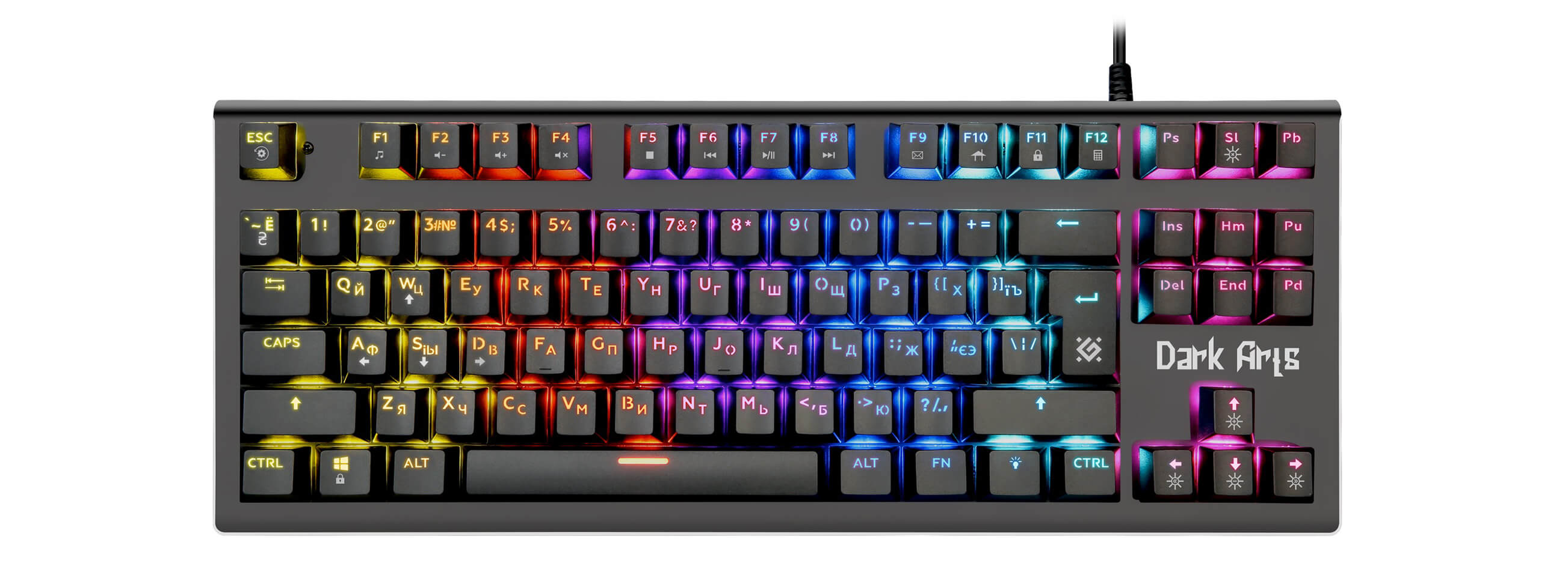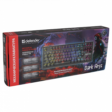 Defender Dark Arts GK-375 - игровая механическая клавиатура, с линейными переключателями Outemu Red. Благодаря технологии Double Injection, символы не сотрутся, так как клавиши отлиты из двух цветов пластика: черный для области колпачка и белый/прозрачный для символов.