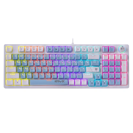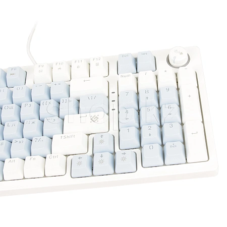 Стильная механическая клавиатура с кейкапами двух цветов и тихими коричневыми свитчами. Главные особенности модели: радужная подсветка, возможность замены свитчей, благодаря технологии Hot Swap, а также наличие кнопки-регулятора для управления громкостью и подсветкой.