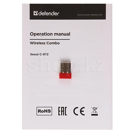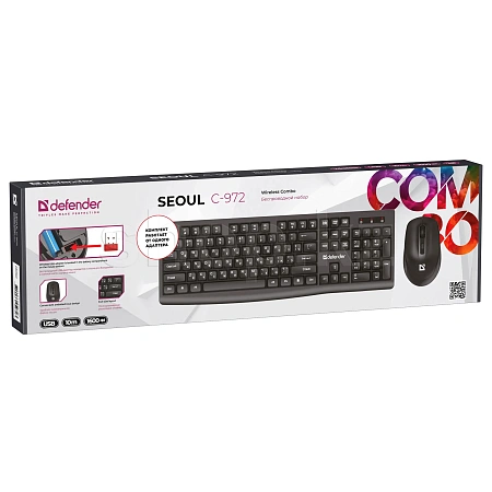 Defender Seoul C-972 - недорогой беспроводной комплект для повседневной работы. В набор входит клавиатура с полноразмерной раскладкой и возможностью управления мультимедийными программами с помощью кнопки FN, а также мышь симметричной формы. Мышь имеет 3 разрешения: 1000-1200-1600 dpi. Комплект работает от одного приемника.