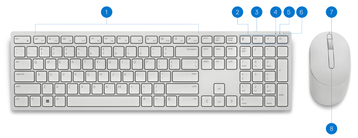 1. Программируемые клавиши | 2. Выделенные клавиши | 3. Включение/выключение | 4. Блокировка CAPS | 5. Блокировка Num | 6. Индикатор срока службы батареи | 7. Колесо прокрутки (программируемая средняя кнопка) | 8. Индикатор заряда батареи