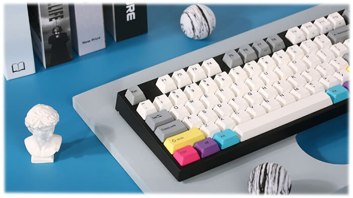 Основной цвет модели CMYK – холодный белый, который плавно переходит в серый, а главную визуальную стилистику кейборда создают яркие кейкапы желтого, розового, фиолетового, оранжевого и голубого цветов.