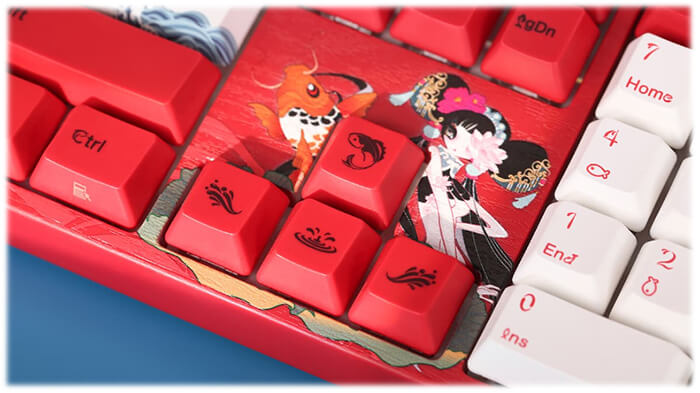 Дизайн Varmilo Koi — воплощение китайской мудрости и искусства. Рисунки на кейкапах рассказывают легенду о карпе, перепрыгивающем через водопад Хуанхэ у Врат Дракона. Традиционный китайский красный цвет корпуса благословляет на удачу — маленькая сказка прямо под руками.