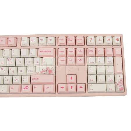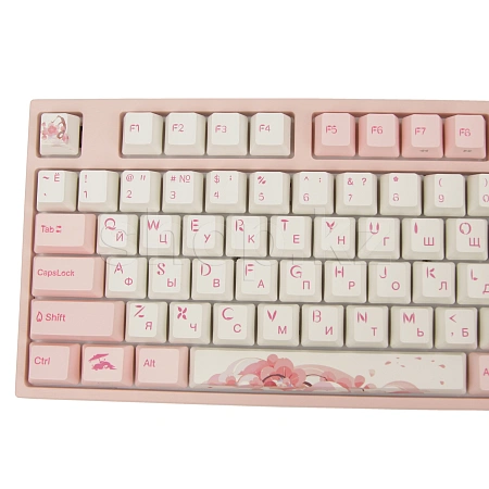 Клавиатура Varmilo имеет не только оригинальный дизайн: колпачки изготовлены из высокопрочного пластика PBT с применением dye-sublimation технологии с выгравированными символами на боках, использование dye-sub позволяет символам никогда не стереться и никак не чувствоваться при печати, а качественный PBT пластик гарантирует надежность и долговечность, клавиши имеют слегка текстурированный верх и приятны на ощупь.