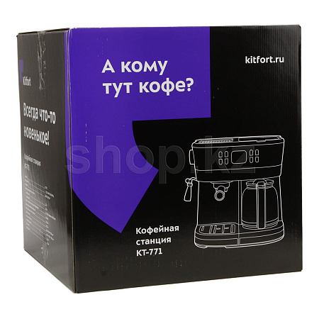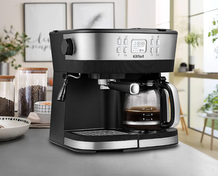 Кофейная станция Kitfort KT-771 совмещает в себе два вида кофеварок: рожковая и капельная. Благодаря чему будет удобна, как и тем, кто пьёт все виды кофе и хочет сэкономить место на своей кухне, так и семьям с разными вкусовыми предпочтениями.