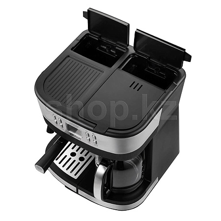 Кофеварка оснащена двумя индивидуальными резервуарами для воды. Резервуар капельной кофеварки ёмкостью 1,5 л позволяет за один раз приготовить кофе на 10 больших порций по 150 мл. Рожковая оснащена резервуаром в 800 мл.