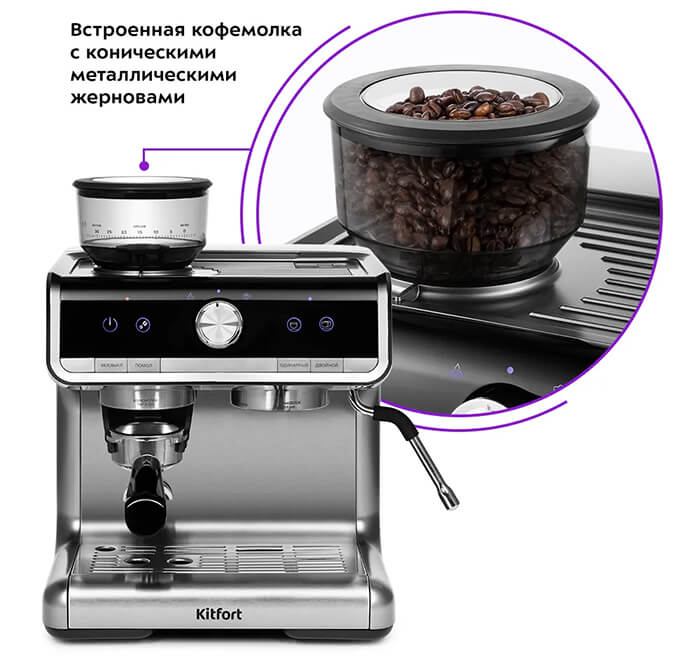 Встроенная кофемолка с коническими металлическими жерновами позволяет качественно измельчать кофейные зерна непосредственно перед приготовлением, что положительно отражается на вкусе готового напитка.