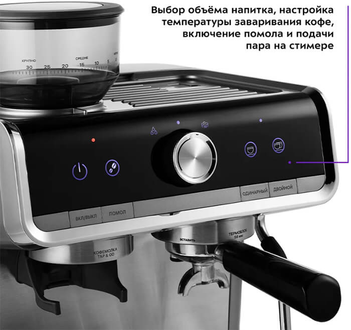 В комплекте к кофеварке идет профессиональный металлический темпер и питчер. Благодаря этому кофеварку можно использовать сразу из коробки и не приобретать данные аксессуары дополнительно.