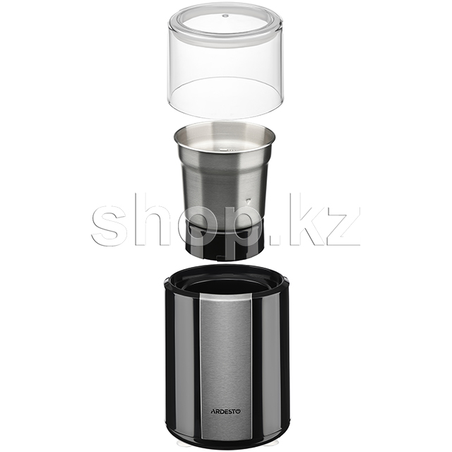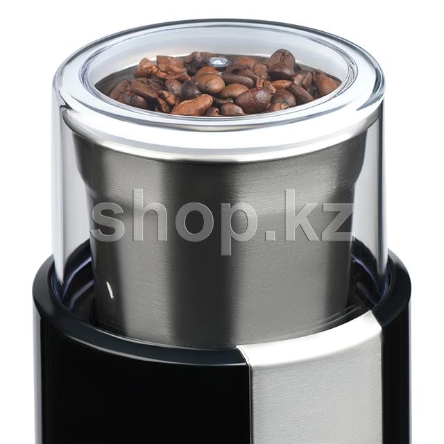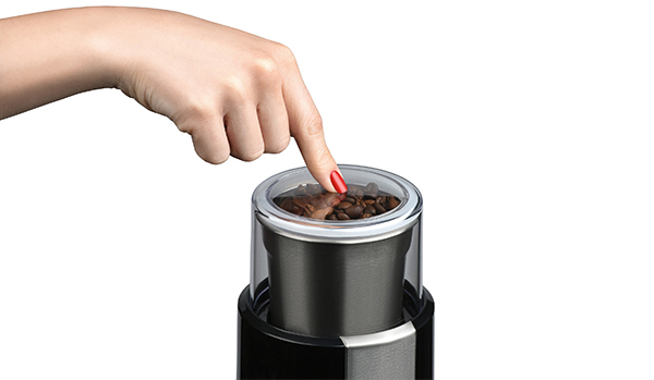 Корпус кофемолки выполнен из прочного матового черного пластика и вставок из шлифованного металла. Прозрачная крышка с прорезиненным уплотнителем позволяет контролировать процесс работы, а съемный стальной контейнер на 60 г – простой доступ к измельченным продуктам и легкую очистку.