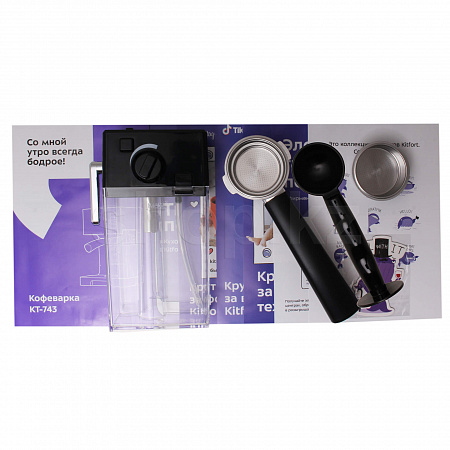 В комплекте к кофеварке идёт ложка-темпер. Темпер используется для утрамбовки молотого кофе и как мерная ложка. Металлический фильтр у рожка идёт с лазерным нанесением отверстий. Он долговечен и не требует использования каких-либо расходующихся частей.