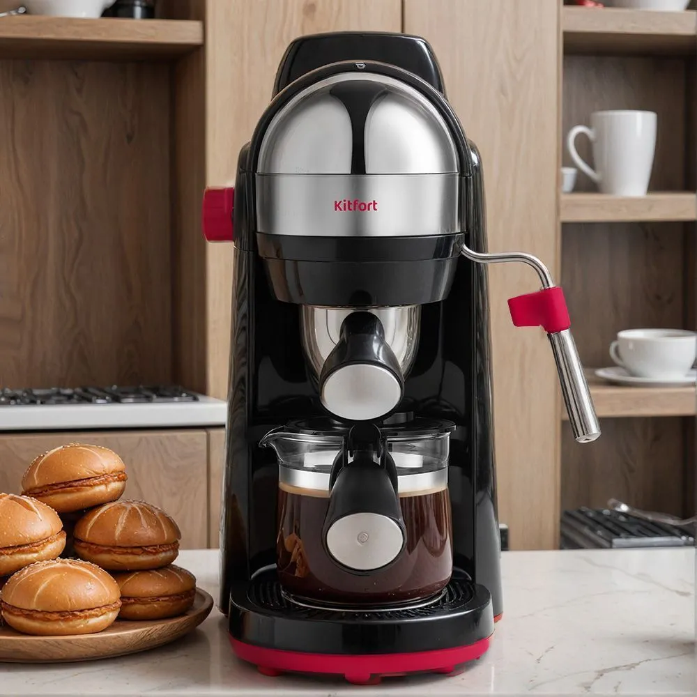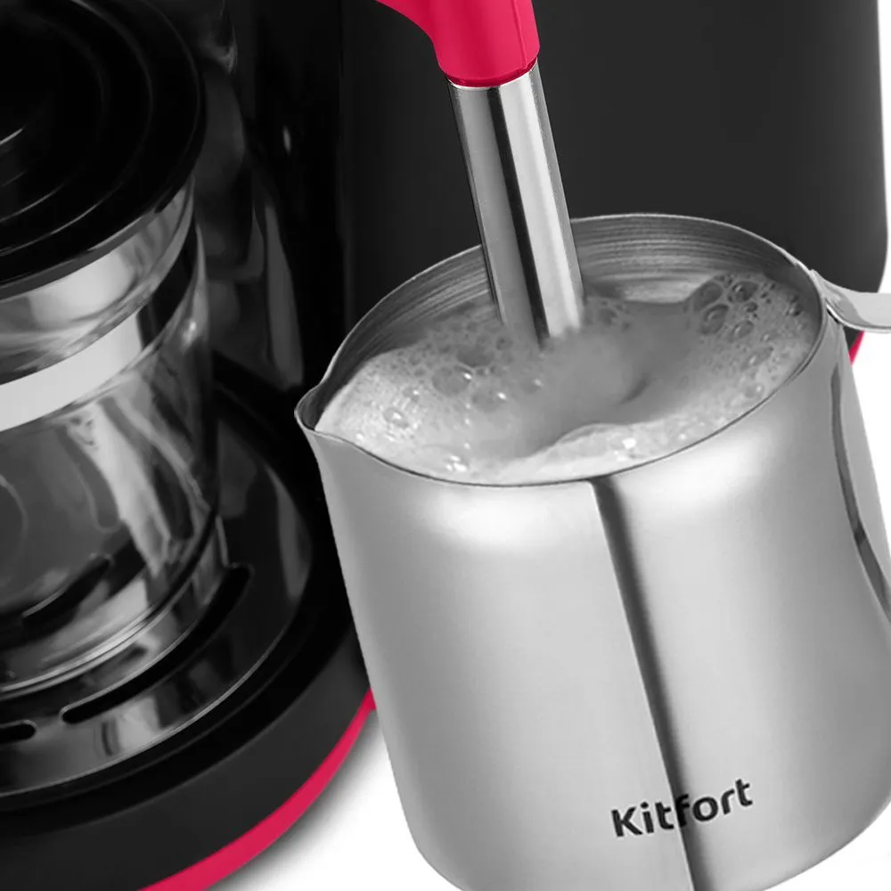 Приготовлю эспрессо, сделаю пенку, подогрею напитки! Рожковая полуавтоматическая кофеварка КТ-7444 поможет приготовить от 2 до 4 порций эспрессо за один раз. С помощью стимера вы можете приготовить молочную пенку, а также подогреть паром остывший чай или другие напитки. Простое управлениеУправление устройством осуществляется с помощью переключателя питания и регулятора. Регулятор может находиться в следующих положениях: «Кофе», «Пауза, «Выкл», «Пар». Индикатор работы горит во время нагрева бойлера и приготовления кофе. Нежная и однородная пенка для капучино Молочную пенку для капучино можно делать самостоятельно. Для подачи пара в кофеварке есть паровая трубка – стимер. Стимер погружают в холодное молоко, включают подачу пара и взбивают молочную пенку. Насадка панарелло облегчает процесс приготовления пенки. Насыщенность и густота благодаря холдеру! Ключевым отличием рожковой кофеварки от других кофеварок является наличие рожка – холдера. Молотый кофе помещается в фильтр рожка и прессуется в таблетку. Металлический рожок хорошо прогревает напиток, кофе получается с хорошей пенкой, насыщенным, густым.