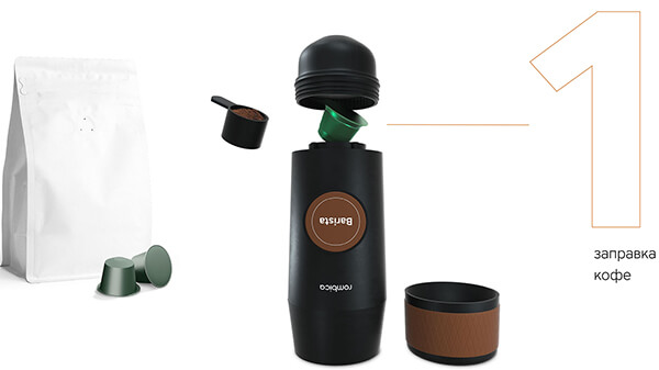 Barista – это компактная кофемашина, она с лёгкостью помещается в сумку, работает без розетки от встроенного аккумулятора. Все что вам потребуется для приготовления ароматного и свежего эспрессо – это кипяток и кофе.