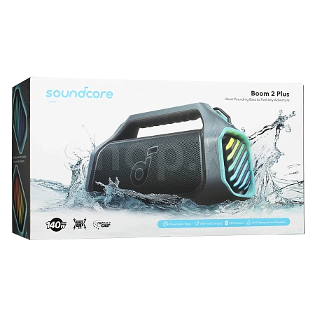 Soundcore Boom 2 Plus выдержит любые приключения, поэтому вы можете слушать музыку без опасений на пляже, у бассейна или под дождем. Аккумулятор емкостью 7500 мАч позволяет использовать колонку без подзарядки в течение 20 часов.