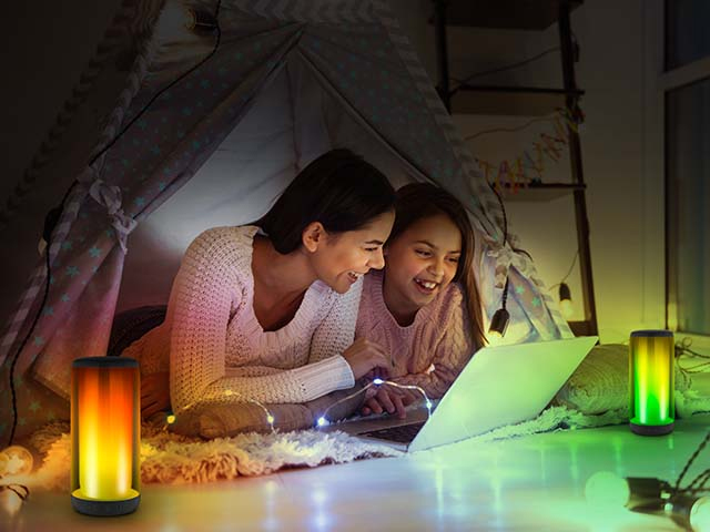 Подсветка колонки может работать в режиме, имитирующем всполохи пламени от большой свечи или костра. Ее можно оставить работать на всю ночь для создания легкого атмосферного освещения в качестве ночника — с играющей музыкой или без нее.