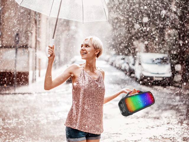 Капли воды, попадающие на портативную колонку под любым углом, не окажут вредного воздействия на прибор. Она не боится проливного дождя или случайных брызг.